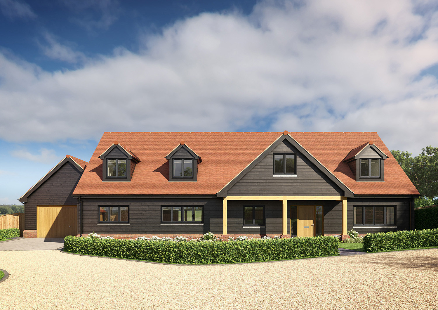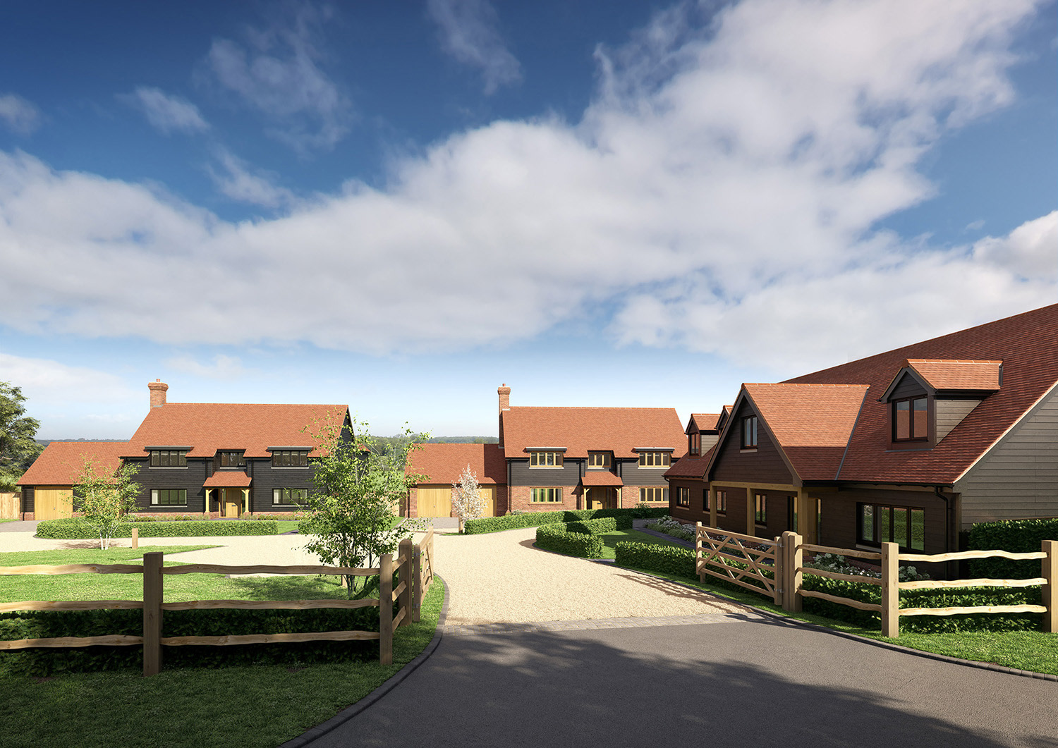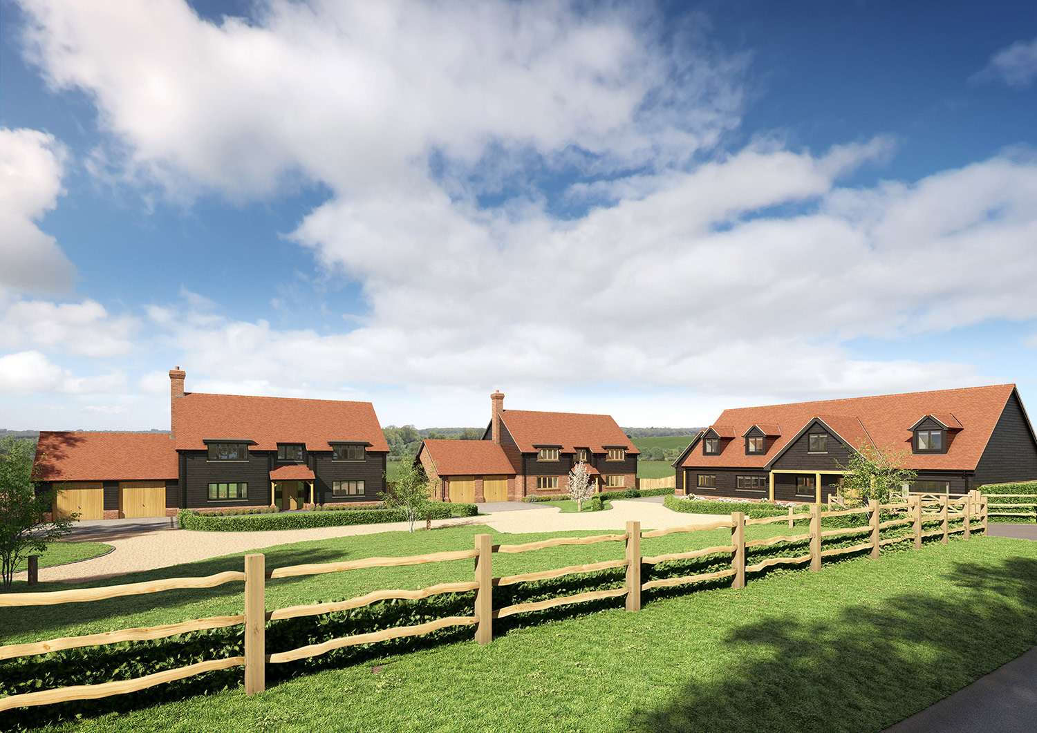 Marketing CGIs for a development of 3 large, detached family homes, with materials and detailing typical of local barns and agricultural buildings.